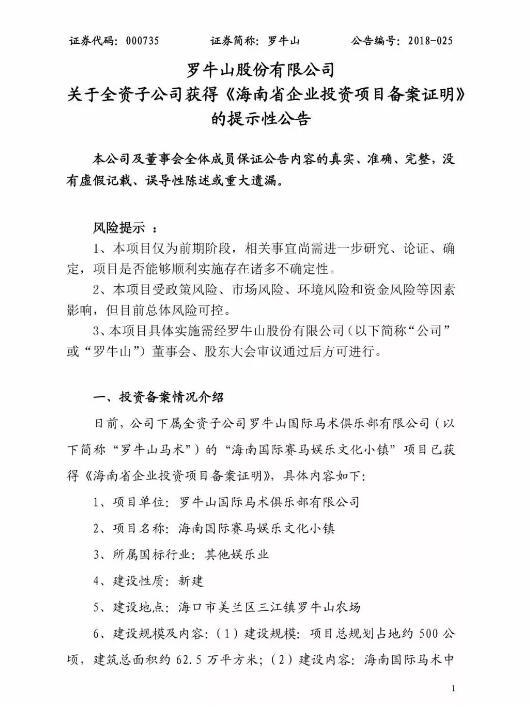 日前,公司下屬全資子公司羅牛山國際馬術(shù)俱樂部有限公司的“海南國際賽馬娛樂文化小鎮(zhèn)”項目已獲得《海南省企業(yè)投資項目備案證明》。