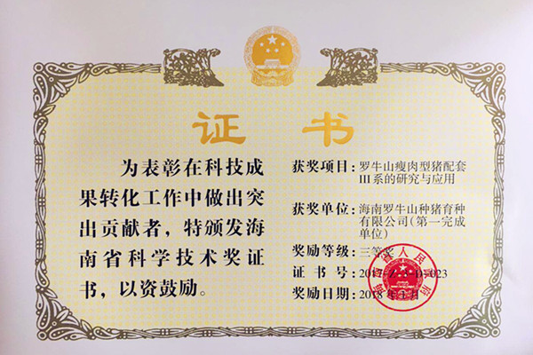 6月28日下午,海南省科學(xué)技術(shù)獎(jiǎng)勵(lì)大會(huì)在省政協(xié)會(huì)堂召開,表彰為海南科技創(chuàng)新和經(jīng)濟(jì)社會(huì)發(fā)展做出突出貢獻(xiàn)的科技工作者。經(jīng)省科學(xué)技術(shù)獎(jiǎng)評審委員會(huì)評審,我司“羅牛山瘦肉型豬配套Ⅲ系豬的研究與應(yīng)用” 榮獲海南省科技成果轉(zhuǎn)化獎(jiǎng)三等獎(jiǎng)。