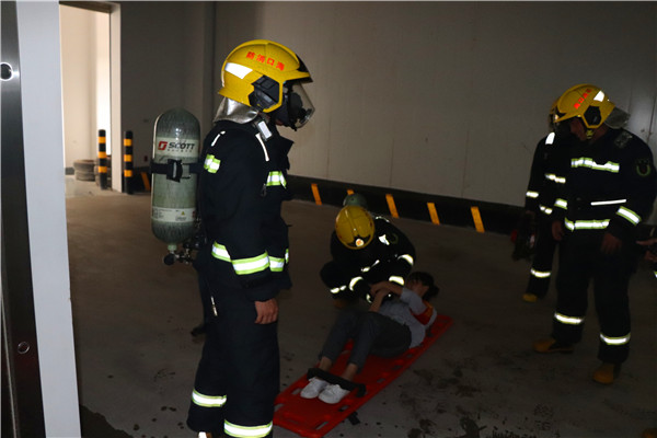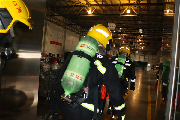 圖解:人員疏散完成,按照顧客名稱、部門開始清點人數(shù),發(fā)現(xiàn)運輸部韓振沒有撤離出來,搜救組立即返回庫內(nèi)開展搜救