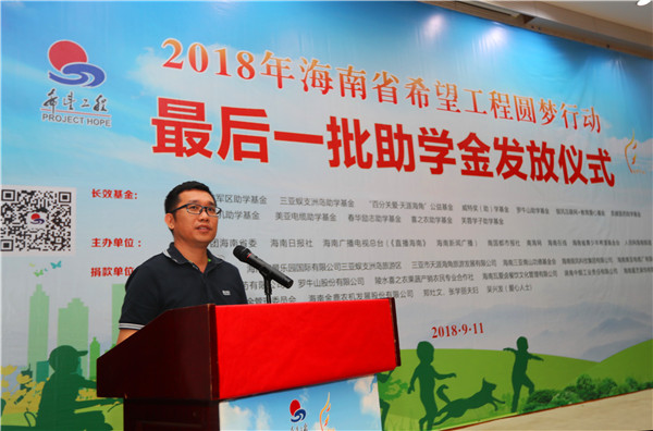 儀式上,團(tuán)省委副書記、省青聯(lián)主席曾鋒代表主辦單位致辭。他對(duì)“海南希望工程圓夢(mèng)行動(dòng)”這一為民辦實(shí)事辦好事的惠民工程給予了充分的肯定;對(duì)長期以來關(guān)注、支持、參與公益助學(xué)活動(dòng)的愛心單位(人士)表示衷心感謝;更對(duì)廣大貧困學(xué)子立志成才、回報(bào)社會(huì)寄予期望。