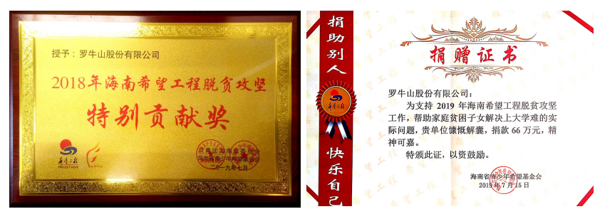 榮獲“2018年海南希望工程脫貧攻堅(jiān)特別貢獻(xiàn)獎(jiǎng)” 羅牛山現(xiàn)場(chǎng)捐款66萬(wàn)元(圖為捐贈(zèng)證書(shū))