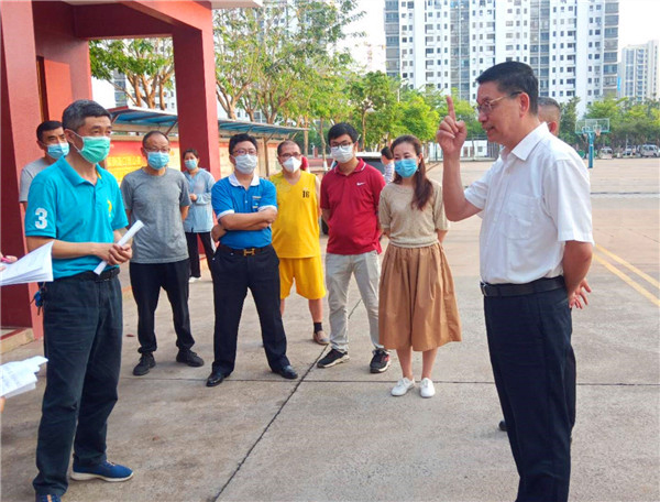 2020年3月23日,??谑姓f(xié)副主席、市教育局局長(zhǎng)厲春,??谑薪逃贮h組成員林元山到??诰吧綄W(xué)校視察初三、高三學(xué)生返校復(fù)課等工作準(zhǔn)備情況。學(xué)校黨支部副書(shū)記王禮坤、副校長(zhǎng)范鐵妹以及校辦主任、學(xué)校疫情防控突擊小組組長(zhǎng)饒文輝等人陪同檢查。