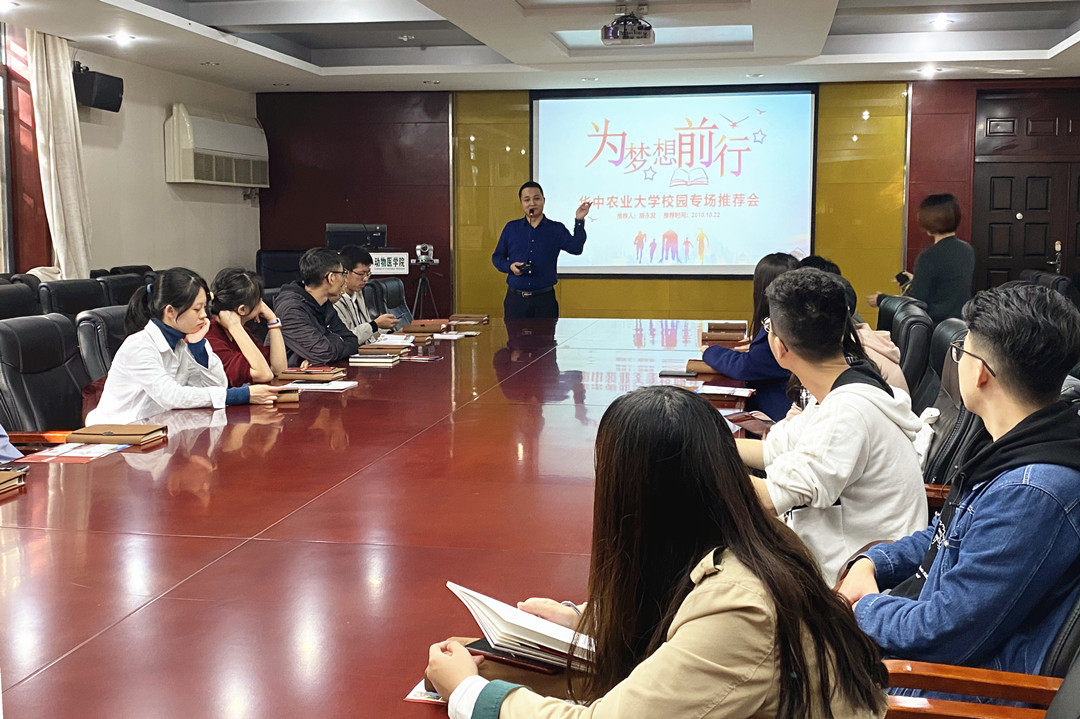 10月22日,海南羅牛山畜牧有限公司人力資源團(tuán)隊(duì)走進(jìn)華中農(nóng)業(yè)大學(xué),并在動(dòng)物科學(xué)技術(shù)學(xué)院組織舉辦了公司推薦會(huì)。次日,畜牧公司受邀參加了華中農(nóng)大2020年秋季供需見面會(huì)。見面會(huì)現(xiàn)場(chǎng),公司收到近百份簡(jiǎn)歷,有部分學(xué)生已達(dá)成初步就業(yè)意向。