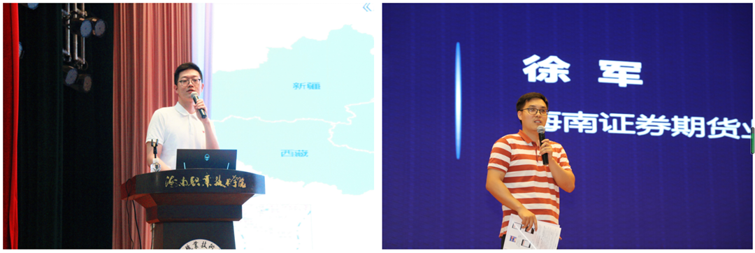 圖說(shuō):海南證監(jiān)局的李芃樹老師(左)向同學(xué)們介紹了活動(dòng)背景、賽程安排、參與方式、獲獎(jiǎng)機(jī)制等內(nèi)容;海南證券期貨業(yè)協(xié)會(huì)的徐軍老師(右)向同學(xué)們?cè)敿?xì)講解了競(jìng)賽規(guī)則及答題技巧。