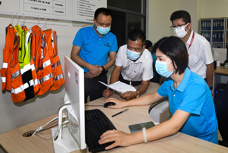 圖說:??谑惺袌霰O(jiān)督管理局桂林洋分局工作人員查看倉運(yùn)通系統(tǒng)操作步驟。