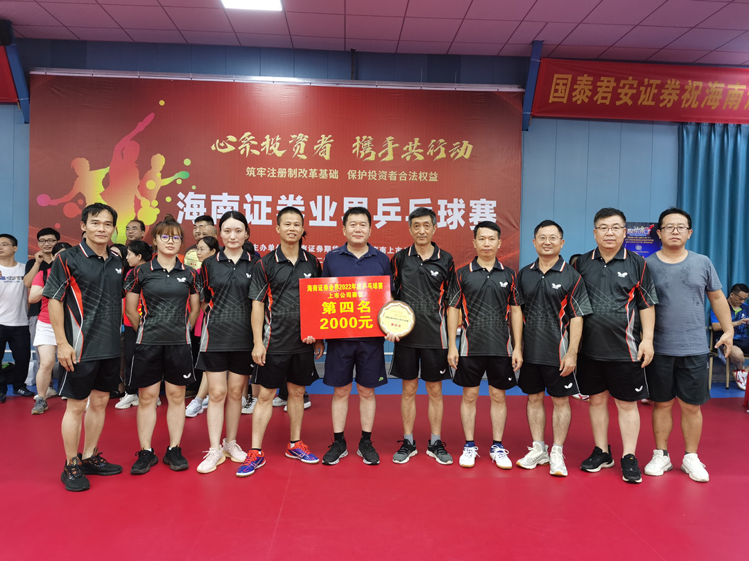 7月9日下午,由海南證券期貨業(yè)協(xié)會(huì)和海南上市公司協(xié)會(huì)聯(lián)合舉辦的2022年度海南證券業(yè)界乒乓球賽順利落下帷幕。經(jīng)過緊張激烈的角逐,公司代表隊(duì)榮獲了本賽事上市公司賽區(qū)第四名的佳績(jī)。
