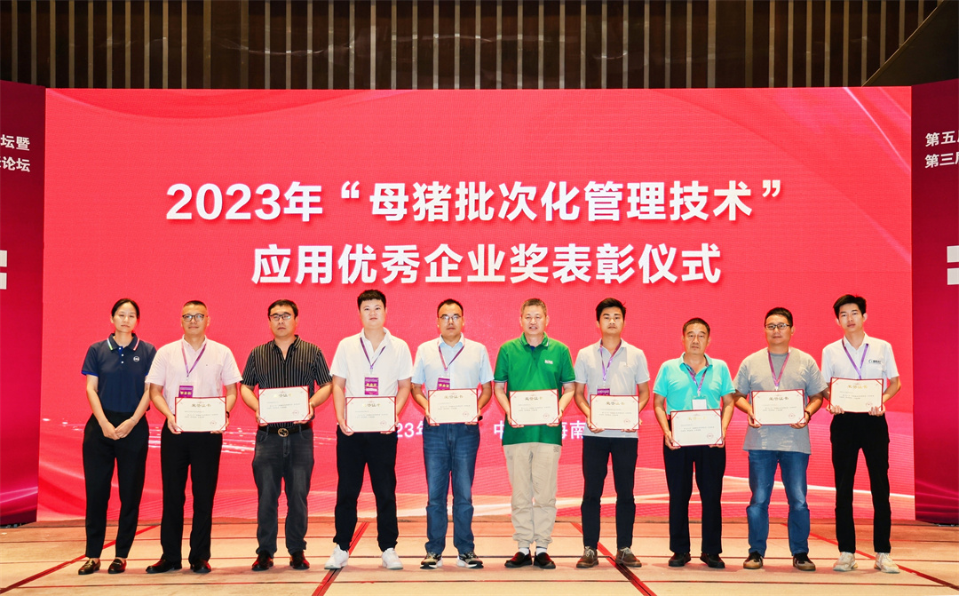 圖說:羅牛山畜牧公司榮獲“2023年母豬批次化管理技術(shù)應(yīng)用優(yōu)秀企業(yè)獎”,公司市場總監(jiān)萬長華(右五)代表公司領(lǐng)獎。