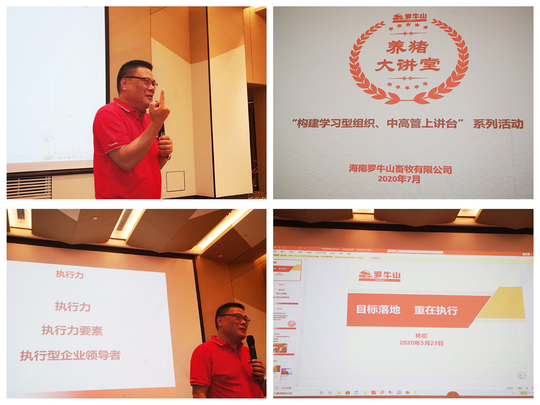 圖說:畜牧團隊“養(yǎng)豬大講堂”現(xiàn)場。羅牛山股份有限公司總裁助理林初、畜牧公司副總經(jīng)理王大林分別帶來《目標落地,重在執(zhí)行》及《非對稱思維核心競爭力》的課程分享。
