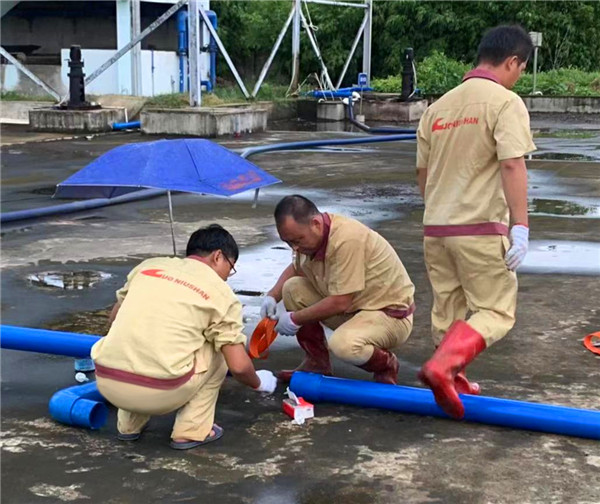 圖2:安全與設(shè)備管理部的小伙伴們正在用膠水對(duì)管道進(jìn)行連接,施工過(guò)程中突然下起雨,為保證膠水粘黏效果,他們撐起傘遮住管道連接處,全然不顧自己被雨水淋濕。