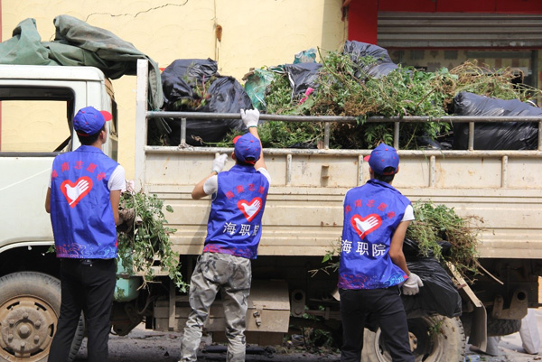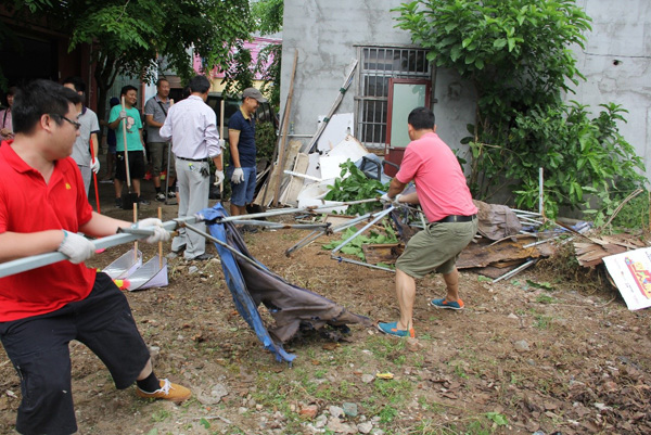 志愿者們頭頂烈日,手持鐵鏟、鋤頭、掃把一同清理衛(wèi)生死角,