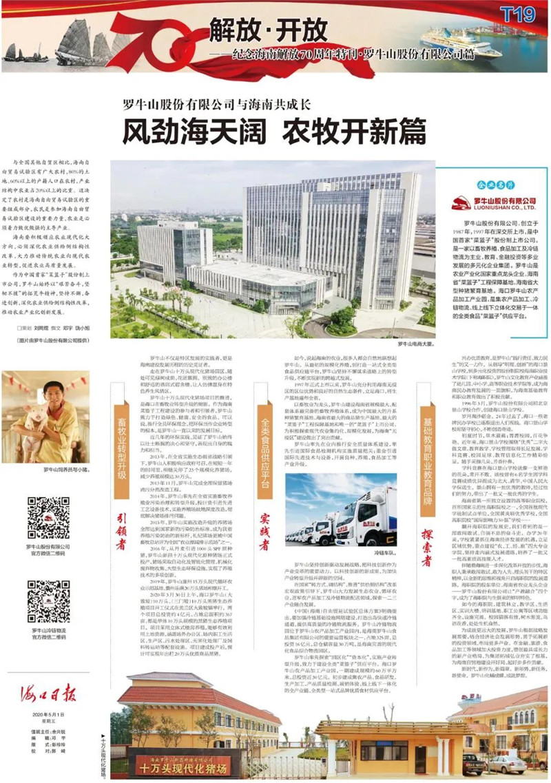 羅牛山股份有限公司,創(chuàng)立于1987年,1997年在深交所上市,是中國首家“菜籃子”股份制上市公司。是一家以畜牧養(yǎng)殖、食品加工及冷鏈物流為主業(yè),教育、金融投資等多業(yè)發(fā)展的多元化企業(yè)集團(tuán)。羅牛山是農(nóng)業(yè)產(chǎn)業(yè)化國家重點(diǎn)龍頭企業(yè),海南省“菜籃子”工程保障基地,海南省大型種豬繁育基地。??诹_牛山農(nóng)產(chǎn)品加工產(chǎn)業(yè)園,是集農(nóng)產(chǎn)品加工、冷鏈物流、線上線下立體化交易于一體的全類食品“菜籃子”供應(yīng)平臺(tái)。